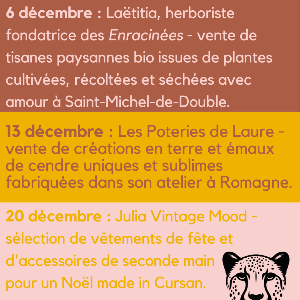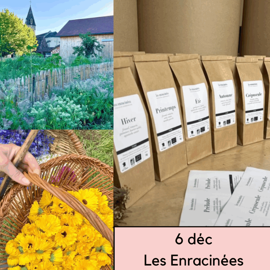 Le samedi 6 décembre : rencontrez Laëtitia, herboriste fondatrice des Enracinées, qui cultive, cueille, sèche, prépare et vend des tisanes extraordinaires à base de plantes non mixées pour plus de goût et de vertus. Toutes sont délicieuses ! Pour vous ou pour offrir, ça va ronronner sous le plaid. Une dégustation est même prévue !